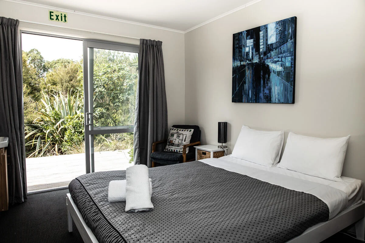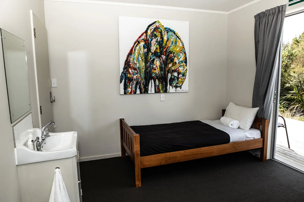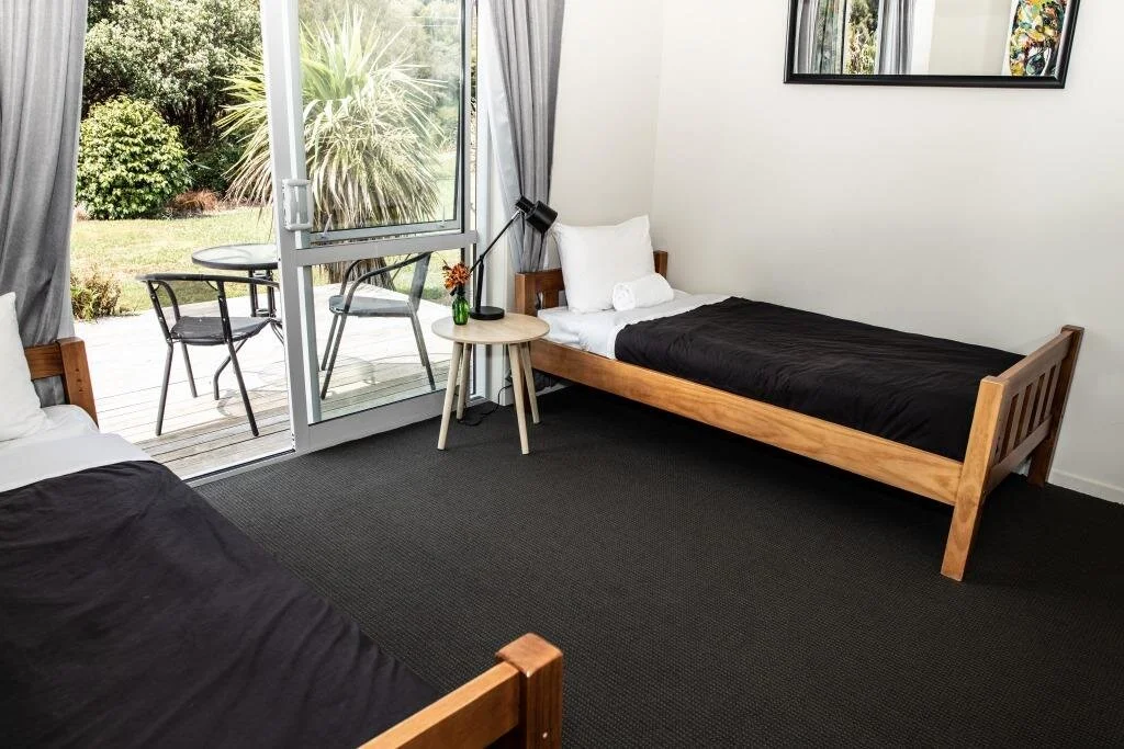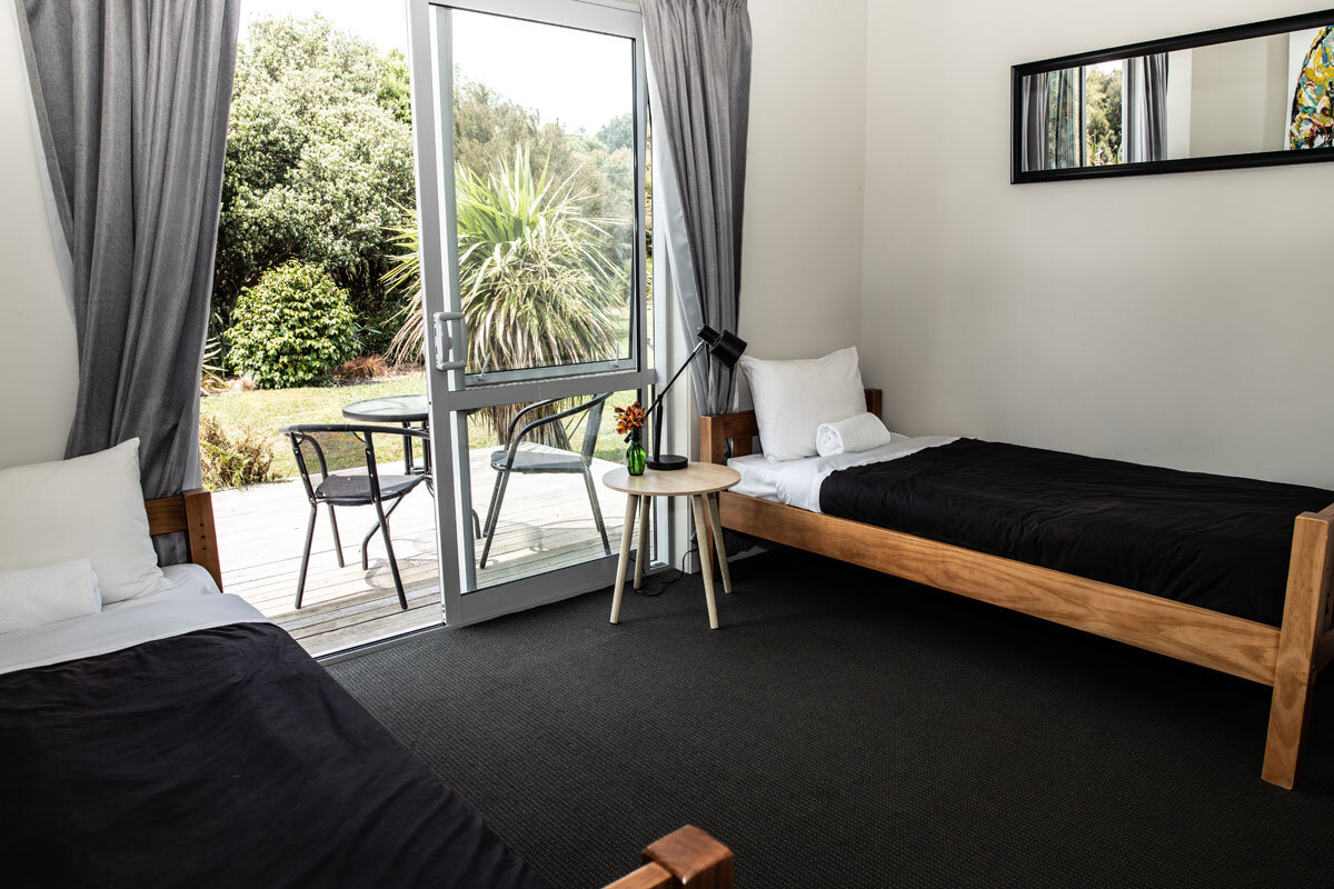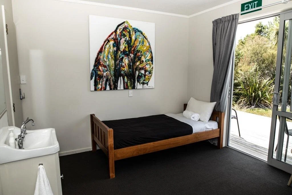 The East Lodge houses bedrooms number 7-12 and also has a simple kitchen area and lounge. All but one of the bedrooms have access through a sliding door to a shared deck. There are three toilets and two showers (one wheelchair accessible) shared between these rooms. This lodge and its bedrooms are only opened if there are more guests than will fit in the Main Lodge.